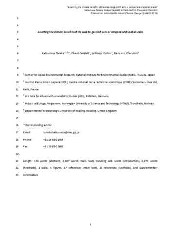 Tanaka, K., Cavalett, O., Collins, B. orcid id iconORCID: https://orcid.org/0000-0002-7419-0850 and Cherubini, F. (2019) Asserting the climate benefits of the coal-to-gas shift across temporal and spatial scales. Nature Climate Change, 9. pp. 389-396. ISSN 1758-678X doi: 10.1038/s41558-019-0457-1