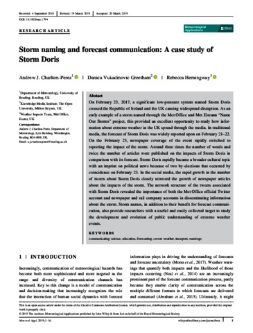 On the 23rd February 2017, a significant low‐pressure system named Storm Doris crossed the Republic of Ireland and the UK causing widespread disruption. As an early example of a storm named through the Met Office and Met Eireann ‘Name our Storms’ project, this provided an excellent opportunity to study how information about extreme weather in the UK spread through the media. In traditional media, the forecast of Storm Doris was widely reported upon on the 21st and 22nd February. On the 23rd February, newspaper coverage of the event rapidly switched to reporting the impact of the storm. Around three times the number of words and twice the number of articles were published about the impacts of Storm Doris in comparison to its forecast. Storm Doris rapidly became a broader cultural topic with an imprint on political news because of two by‐elections that occurred by coincidence on the 23rd February. In the social media, rapid growth of the number of tweets about Storm Doris closely mirrored the growth of newspaper articles about the impacts of the storm. The network structure of the tweets associated with Storm Doris revealed the importance of both the Met Office official twitter account and newspaper and rail company accounts in disseminating information about the storm. Storm names, in addition to their benefit for forecast communication, also provide researchers with a useful and easily collected target to study the development and evolution of public understanding of extreme weather events.