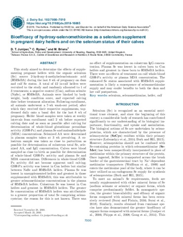 Juniper, D. T., Rymer, C. orcid id iconORCID: https://orcid.org/0000-0002-3535-4330 and Briens, M. (2019) Bio-efficacy of hydroxy-selenomethionine as a selenium supplement in pregnant dairy heifers and on the selenium status of their calves. Journal of Dairy Science, 102 (8). pp. 7000-7010. ISSN 0022-0302 doi: 10.3168/jds.2018-16065