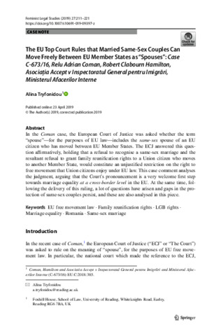 In the Coman case, the European Court of Justice was asked whether the term “spouse” – for the purposes of EU law – includes the same-sex spouse of an EU citizen who has moved between EU Member States. The ECJ answered this question affirmatively, holding that a refusal to recognise a same-sex marriage and the resultant refusal to grant family reunification rights to a Union citizen who moves to another Member State, would constitute an unjustified restriction on the right to free movement that Union citizens enjoy under EU law. This case comment analyses the judgment, arguing that the Court’s pronouncement is a very welcome first step towards marriage equality at a cross-border level in the EU. At the same time, following the delivery of this ruling, a lot of questions have arisen and gaps in the protection of same-sex couples persist, and these are also analysed in this piece.