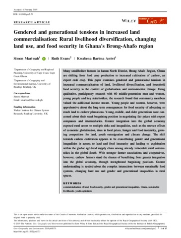 Many smallholder farmers in Jaman North District, Brong‐Ahafo Region, Ghana are shifting from food crop production to increased cultivation of cashew, an export cash crop. This paper examines gendered and generational tensions in increased commercialisation of land, livelihood diversification, and household food security in the context of globalisation and environmental change. Using qualitative, participatory research with 60 middle‐generation men and women, young people and key stakeholders, the research found that community members valued the additional income stream. Young people and women, however, were apprehensive about the long‐term consequences for food security of allocating so much land to cashew plantations. Young, middle, and older generations were concerned about their weak bargaining position in negotiating fair prices with export companies and intermediaries. Greater integration into the global economy exposed rural actors to multiple risks and inequalities, such as the uneven effects of economic globalisation, rises in food prices, hunger and food insecurity, growing competition for land, youth outmigration and climate change. The shift towards cashew cultivation appears to be exacerbating gender and generational inequalities in access to land and food insecurity and leading to exploitation within the global agri‐food supply chain among already vulnerable rural communities in the global South. With stronger farmer associations and cooperatives, however, cashew farmers stand the chance of benefitting from greater integration into the global economy, through strengthened bargaining positions. Greater understanding is needed about the complex interactions between sustainable food systems, changing land use and gender and generational inequalities in rural spaces.