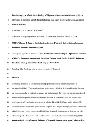 Relationship type affects the reliability of dispersal distance estimated using pedigree inferences in partially sampled populations: a case study involving invasive American mink in Scotland.