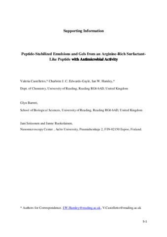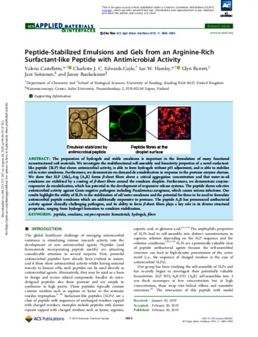 Peptide-stabilized emulsions and gels from an arginine-rich surfactant-like peptide with antimicrobial activity.