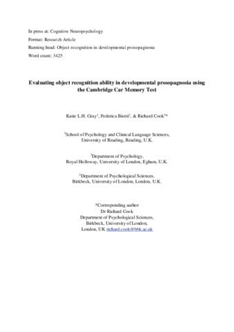 Evaluating object recognition ability in developmental prosopagnosia using the Cambridge Car Memory Test.