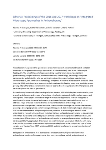 Banerjea, R. Y. orcid id iconORCID: https://orcid.org/0000-0002-1786-357X, Barnett, C., Morandi, L. and Portillo, M. (2020) Integrated microscopy approaches in archaeobotany: proceedings of the 2016 and 2017 workshops, University of Reading, UK. Environmental Archaeology: The Journal of Human Palaeoecology, 25 (2). pp. 131-134. ISSN 1461-4103 doi: 10.1080/14614103.2019.1593654