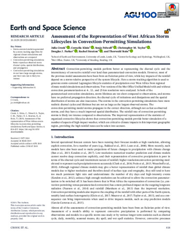 Crook, J., Klein, C., Folwell, S., Taylor, C. M., Parker, D. J., Stratton, R. and Stein, T. orcid id iconORCID: https://orcid.org/0000-0002-9215-5397 (2019) Assessment of the representation of West African storm lifecycles in convection‐permitting simulations. Earth and Space Science, 6 (5). pp. 818-835. ISSN 2333-5084 doi: 10.1029/2018EA000491