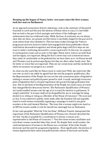 This article will constitute an assessment of the impact of Nancy Astor's election, the challenges she faced and the way her reputation has been shaped in the century since. It will also explore Astor's experience which echoes the challenges still facing women in politics today. Momentous historic milestones, such as the centenary of the partial franchise in 2018 and the election of Nancy Astor in 1919, it is inevitable that we look to the past to find synergies and echoes of the challenges and achievements that are evidenced today. While the lines of continuity are not always clear they are there, the present and the future are inevitably shaped by the past and to some extent those who inhabited it engaging with pathfinders whose contribution demanded recognition inform a response to contemporary issues and as such, in this light, Nancy Astor, both as an individual and her legacy, are important. Being the first is never easy and as historical totems they rarely sit comfortably on the pedestal that we force them on to. However, they are our cornerstone and the yardstick by which we measure our progress as a society.