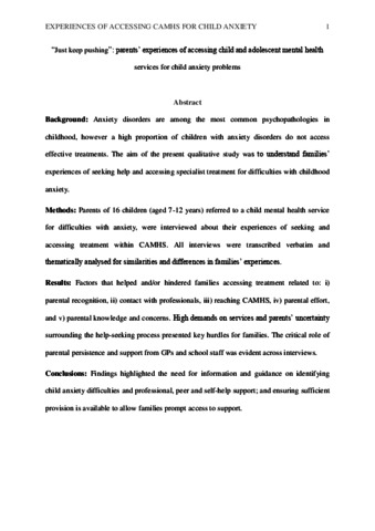 Background:Anxiety disorders are among the most common psychopathologies in childhood, however a high proportion of children with anxiety disorders do not access effective treatments.The aim of the present qualitative study was to understand families’ experiences of seeking help and accessing specialist treatment for difficulties with childhood anxiety.Methods:Parents of 16 children (aged 7-12 years) referred to a child mental health service for difficulties with anxiety, were interviewed about their experiences of seeking and accessing treatment within CAMHS. All interviews were transcribed verbatim and thematically analysed for similarities and differences in families’ experiences. Results:Factors that helped and/or hindered families accessing treatment related to: i) parental recognition, ii) contact with professionals, iii) reaching CAMHS, iv) parental effort, and v) parental knowledge and concerns. High demands on services and parents’ uncertainty surrounding the help-seeking process presented key hurdles for families. The critical role of parental persistence and support from GPs and school staff was evident across interviews.Conclusions:Findings highlighted the need for information and guidance on identifying child anxiety difficulties and professional, peer and self-help support; and ensuring sufficient provision is available to allow families prompt access to support.