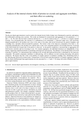 McCusker, K. orcid id iconORCID: https://orcid.org/0000-0002-1886-5323, Westbrook, C. D. orcid id iconORCID: https://orcid.org/0000-0002-2889-8815 and Moiola, A. (2019) Analysis of the internal electric fields of pristine ice crystals and aggregate snowflakes, and their effect on scattering. Journal of Quantitative Spectroscopy and Radiative Transfer, 230. pp. 155-171. ISSN 0022-4073 doi: 10.1016/j.jqsrt.2019.04.019