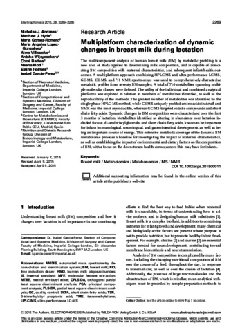 Andreas, N. J., Hyde, M. J., Gomez‐Romero, M., Lopez-Gonzalvez, M. A., Villaseñor, A., Wijeyesekera, A. orcid id iconORCID: https://orcid.org/0000-0001-6151-5065, Barbas, C., Modi, N., Holmes, E. and Garcia-Perez, I. (2015) Multiplatform characterization of dynamic changes in breast milk during lactation. Electrophoresis, 36 (18). pp. 2269-2285. ISSN 0173-0835 doi: 10.1002/elps.201500011