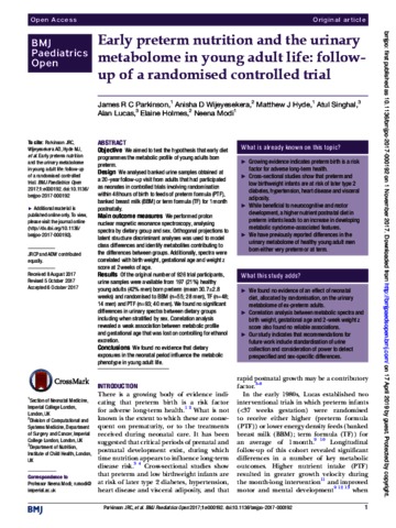 Parkinson, J. R. C., Wijeyesekera, A. D. orcid id iconORCID: https://orcid.org/0000-0001-6151-5065, Hyde, M. J., Singhal, A., Lucas, A., Holmes, E. and Modi, N. (2017) Early preterm nutrition and the urinary metabolome in young adult life: follow-up of a randomised controlled trial. BMJ Paediatrics Open, 1 (1). e000192. ISSN 2399-9772 doi: 10.1136/bmjpo-2017-000192