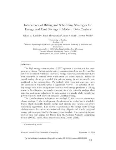 Kunkel, J. M., Shoukourian, H., Heidari, R. and Wilde, T. (2019) Interference of billing and scheduling strategies for energy and cost savings in modern data centers. Sustainable Computing: Informatics and Systems, 23. pp. 49-66. ISSN 2210-5379 doi: 10.1016/j.suscom.2019.04.003