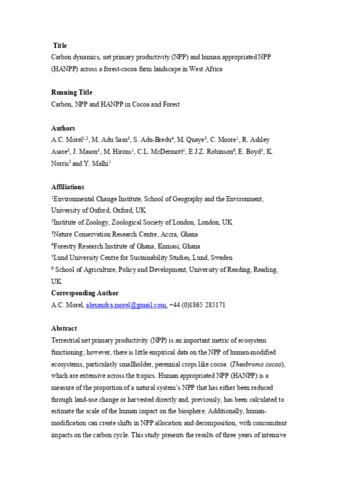 Morel, A. C., Adu Sasu, M., Adu‐Bredu, S., Quaye, M., Moore, C., Ashley Asare, R., Mason, J., Hirons, M., McDermott, C. L., Robinson, E. J. Z. ORCID: https://orcid.org/0000-0002-4950-0183, Boyd, E., Norris, K. and Malhi, Y.