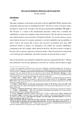 This paper contributes to the debate on the future of the Pre-pack Pool (‘Pool), which has been remarkably underused since its establishment in 2015. The Pool is a body of business experts introduced to improve the oversight of the pre-pack administration procedure (‘Pre-pack’). The Pre-pack is a variant of the administration procedure, which aims to facilitate the rehabilitation of distressed companies and/or their businesses.