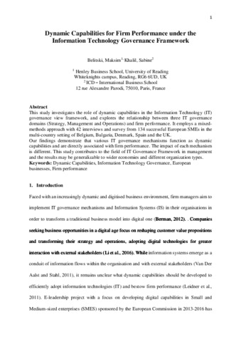Belitski, M. and Khalil, S. (2020) Dynamic capabilities for firm performance under the information technology governance framework. European Business Review, 32 (2). pp. 129-157. ISSN 0955-534X doi: 10.1108/EBR-05-2018-0102
