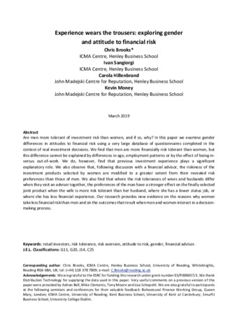 Brooks, C. orcid id iconORCID: https://orcid.org/0000-0002-2668-1153, Sangiorgi, I. orcid id iconORCID: https://orcid.org/0000-0002-8344-9983, Hillenbrand, C. orcid id iconORCID: https://orcid.org/0000-0002-2929-5098 and Money, K. (2019) Experience wears the trousers: exploring gender and attitude to financial risk. Journal of Economic Behavior & Organization, 163. pp. 483-515. ISSN 0167-2681 doi: 10.1016/j.jebo.2019.04.026