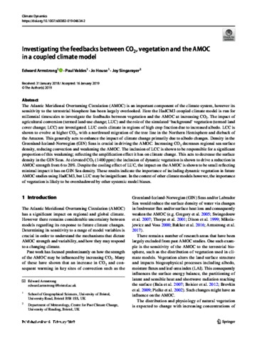 The Atlantic Meridional Overturning Circulation (AMOC) is an important component of the climate system, however its sensitivity to the terrestrial biosphere has been largely overlooked. Here the HadCM3 coupled climate model is run for millennial timescales to investigate the feedbacks between vegetation and the AMOC at increasing CO2. The impact of agricultural conversion (termed land-use change; LUC) and the role of the simulated ‘background’ vegetation (termed land cover change; LCC) are investigated. LUC cools climate in regions of high crop fraction due to increased albedo. LCC is shown to evolve at higher CO2, with a northward migration of the tree line in the Northern Hemisphere and dieback of the Amazon. This generally acts to enhance the impact of climate change primarily due to albedo changes. Density in the Greenland-Iceland-Norwegian (GIN) Seas is crucial in driving the AMOC. Increasing CO2 decreases regional sea surface density, reducing convection and weakening the AMOC. The inclusion of LCC is shown to be responsible for a significant proportion of this weakening; reflecting the amplification effect it has on climate change. This acts to decrease the surface density in the GIN Seas. At elevated CO2 (1400 ppm) the inclusion of dynamic vegetation is shown to drive a reduction in AMOC strength from 6 to 20%. Despite the cooling effect of LUC, the impact on the AMOC is shown to be small reflecting minimal impact it has on GIN Sea density. These results indicate the importance of including dynamic vegetation in future AMOC studies using HadCM3, but LUC may be insignificant. In the context of other climate models however, the importance of vegetation is likely to be overshadowed by other systemic model biases.