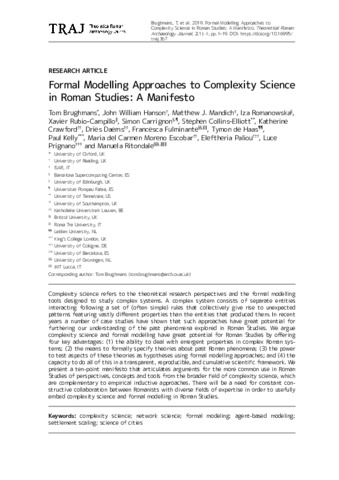 Brughmans, T., Hanson, J., Mandich, M., Romanowska, I., Rubio-Campillo, X., Carrignon, S., Collins-Elliott, S., Crawford, K., Daems, D., Fulminante, F., de Haas, T., Kelly, P., de Carmen, M., Paliou, E., Prignano, L. and Ritondale, M. (2019) Formal modelling approaches to complexity science in Roman Studies: a manifesto. Theoretical Roman Archaeology Journal, 2 (1). pp. 1-19. ISSN 2515-2289 doi: 10.16995/traj.367