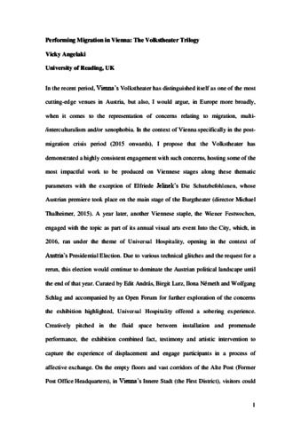 Angelaki, V. (2019) Performing migration in Vienna: the Volkstheater Trilogy. Performing Ethos, 9 (1). pp. 9-22. ISSN 1757-1987 doi: 10.1386/peet_00002_1