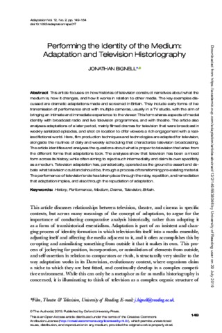 • Bignell, Jonathan. “Performing Television History.” Critical Studies in Television 13.3 (2018): 262-79. Printed.