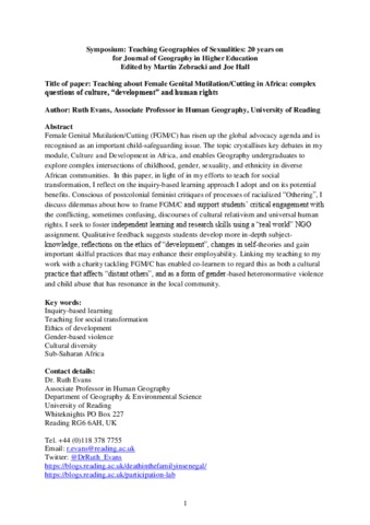 Evans, R. orcid id iconORCID: https://orcid.org/0000-0002-4599-5270 (2020) Teaching about female genital mutilation/cutting in Africa: complex questions of culture, “development” and human rights. Journal of Geography in Higher Education, 44 (2). pp. 230-247. ISSN 1466-1845 doi: 10.1080/03098265.2019.1661371