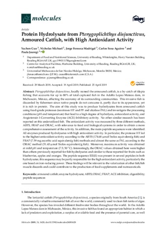 Guo, Y., Michael, N., Fonseca Madrigal, J., Sosa Aguirre, C. and Jauregi, P. (2019) Protein hydrolysate from Pterygoplichthys disjunctivus, armoured catfish, with high antioxidant activity. Molecules, 24 (8). 1628. ISSN 1420-3049 doi: 10.3390/molecules24081628