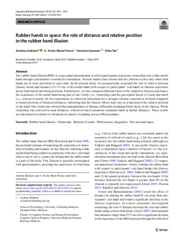 Kalckert, A., Perera, A. T.-M., Ganesan, Y. and Tan, E. (2019) Rubber hands in space: the role of distance and relative position in the rubber hand illusion. Experimental Brain Research, 237 (7). pp. 1821-1832. ISSN 0014-4819 doi: 10.1007/s00221-019-05539-6