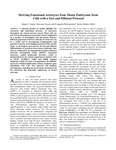 Juneja, D. S., Nasuto, S. orcid id iconORCID: https://orcid.org/0000-0001-9414-9049 and Delivopoulos, E. orcid id iconORCID: https://orcid.org/0000-0001-6156-1133 (2019) Deriving functional astrocytes from mouse embryonic stem cells with a fast and efficient protocol. In: 41st International Engineering in Medicine and Biology Conference, 23-27 July 2019, Berlin, Germany, pp. 2994-2996. doi: 10.1109/EMBC.2019.8857058