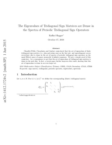 Hagger, R. (2015) The eigenvalues of tridiagonal sign matrices are dense in the spectra of periodic tridiagonal sign operators. Journal of Functional Analysis, 269 (5). pp. 1563-1570. ISSN 0022-1236 doi: 10.1016/j.jfa.2015.01.019