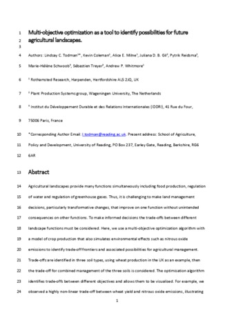 Todman, L. C. orcid id iconORCID: https://orcid.org/0000-0003-1232-294X, Coleman, K., Milne, A. E., Gil, J. D. B., Reidsma, P., Schwoob, M.-H., Treyer, S. and Whitmore, A. P. (2019) Multi-objective optimization as a tool to identify possibilities for future agricultural landscapes. Science of the Total Environment, 687. pp. 535-545. ISSN 0048-9697 doi: 10.1016/j.scitotenv.2019.06.070