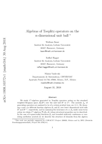 Bauer, W., Hagger, R. and Vasilevski, N. (2019) Algebras of Toeplitz operators on the n-dimensional unit ball. Complex Analysis and Operator Theory, 13 (2). pp. 493-524. ISSN 1661-8262 doi: 10.1007/s11785-018-0837-y