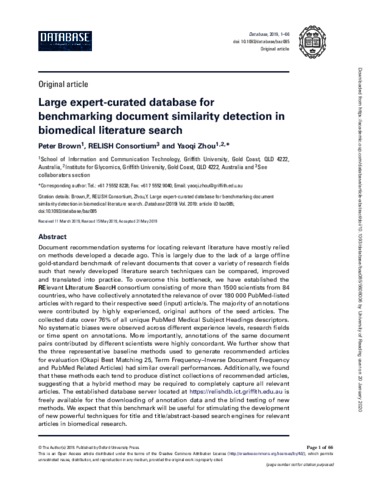 | Additional Information | Correct citation: Brown, P., RELISH Consortium, Zhou, Y. (2019) Large expert-curated database for benchmarking document similarity detection in biomedical literature search. Database. ISSN 1758-0463 (In Press) |