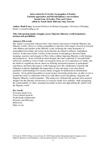 The 'family' is associated with powerful, often emotive discourses in both the Majority and Minority worlds. However, family geographies to date have been largely focused on research with children and families in the Minority world, reflecting the wider dominance of geographical knowledge and social science theories developed in affluent, Anglophone contexts. In this intervention, I reflect on the tensions in attempting to theorise family meanings, practices and struggles in West Africa without imposing Minority world framings and perspectives. In my research in urban Senegal, the team's approach of 'uncomfortable reflexivity' enabled us to have frank conversations about our own experiences of 'family' and the death of a significant person, about our differing emotional responses to participants' experiences and about the nuances of the language used. My collaborative research with Ghanaian academics highlights the importance of time and space to develop shared qualitative understandings of everyday family struggles for publication in international journals. Given global inequalities in social science knowledge production, an ethic of care is needed that seeks to collaborate reflexively with others across disciplinary, linguistic and Majority-Minority world boundaries. This endeavour will hopefully generate more nuanced insights into the plurality and diversity of everyday family lives globally, while recognising the commonalities we share, situating knowledge in place and approaching the 'global' from the Majority world.