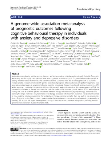 Rayner, C., Coleman, J. R. I., Purves, K. L., Hodsoll, J., Goldsmith, K., Alpers, G. W., Andersson, E., Arolt, V., Boberg, J., Bögels, S., Creswell, C., Cooper, P., Curtis, C., Deckert, J., Domschke, K., El Alaoui, S., Fehm, L., Fydrich, T., Gerlach, A. L., Grocholewski, A., Hahlweg, K., Hamm, A., Hedman, E., Heiervang, E. R., Hudson, J. L., Jöhren, P., Keers, R., Kircher, T., Lang, T., Lavebratt, C., Lee, S.-H., Lester, K. J., Lindefors, N., Margraf, J., Nauta, M., Pané-Farré, C. A., Pauli, P., Rapee, R. M., Reif, A., Rief, W., Roberts, S., Schalling, M., Schneider, S., Silverman, W. K., Ströhle, A., Teismann, T., Thastum, M., Wannemüller, A., Weber, H., Wittchen, H.-U., Wolf, C., Rück, C., Breen, G. and Eley, T. C. (2019) A genome-wide association meta-analysis of prognostic outcomes following cognitive behavioural therapy in individuals with anxiety and depressive disorders. Translational Psychiatry, 9 (1). 150. ISSN 2158-3188 doi: 10.1038/s41398-019-0481-y