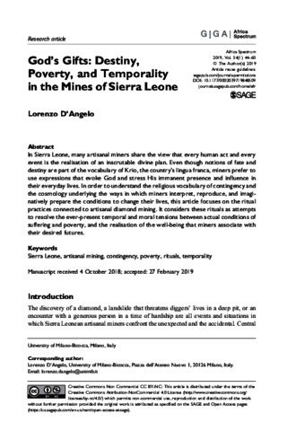 D'Angelo, L. (2019) God’s gifts: destiny, poverty, and temporality in the mines of Sierra Leone. Africa Spectrum, 54 (1). pp. 44-60. ISSN 1868-6869 doi: 10.1177/0002039719848509