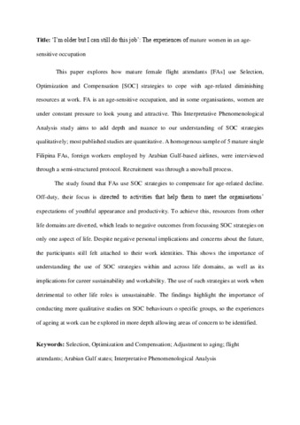 This paper explores how mature female flight attendants [FAs] use Selection, Optimization and Compensation [SOC] strategies to cope with age-related diminishing resources at work. FA is an age-sensitive occupation, and in some organisations, women are under constant pressure to look young and attractive. This Interpretative Phenomenological Analysis study aims to add depth and nuance to our understanding of SOC strategies qualitatively; most published studies are quantitative. A homogenous sample of 5 mature single Filipina FAs, foreign workers employed by Arabian Gulf-based airlines, were interviewed through a semi-structured protocol. Recruitment was through a snowball process. The study found that FAs use SOC strategies to compensate for age-related decline. Off-duty, their focus is directed to activities that help them to meet the organisations’ expectations of youthful appearance and productivity. To achieve this, resources from other life domains are diverted, which leads to negative outcomes from focussing SOC strategies on only one aspect of life. Despite negative personal implications and concerns about the future, the participants still felt attached to their work identities. This shows the importance of understanding the use of SOC strategies within and across life domains, as well as its implications for career sustainability and workability. The use of such strategies at work when detrimental to other life roles is unsustainable. The findings highlight the importance of conducting more qualitative studies on SOC behaviours o specific groups, so the experiences of ageing at work can be explored in more depth allowing areas of concern to be identified.