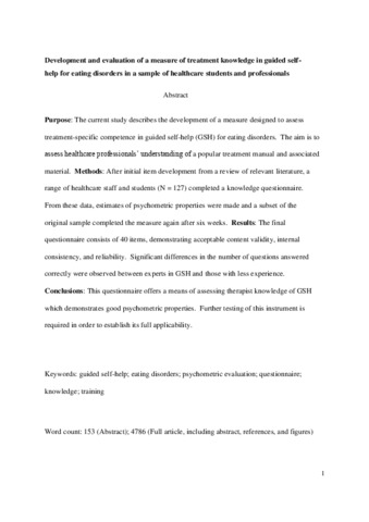 Purpose: The current study describes the development of a measure designed to assess treatment-specific competence in guided self-help (GSH) for eating disorders. The aim is to assess healthcare professionals’ understanding of a popular treatment manual and associated material. Methods: After initial item development from a review of relevant literature, a range of healthcare staff and students (N = 127) completed a knowledge questionnaire. From these data, estimates of psychometric properties were made and a subset of the original sample completed the measure again after six weeks. Results: The final questionnaire consists of 40 items, demonstrating acceptable content validity, internal consistency, and reliability. Significant differences in the number of questions answered correctly were observed between experts in GSH and those with less experience. Conclusions: This questionnaire offers a means of assessing therapist knowledge of GSH which demonstrates good psychometric properties. Further testing of this instrument is required in order to establish its full applicability.