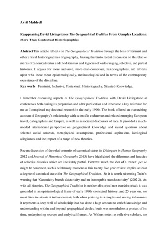 Reappraising David Livingstone's The Geographical Tradition from complex locations: more‐than‐contextual historiographies