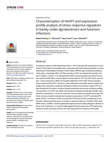 Characterisation of HvVIP1 and expression profile analysis of stress response regulators in barley under Agrobacterium and Fusarium infections.