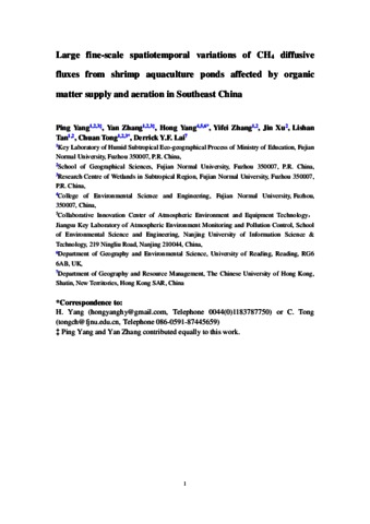 Large fine‐scale spatiotemporal variations of CH4 diffusive fluxes from shrimp aquaculture ponds affected by organic matter supply and aeration in Southeast China.