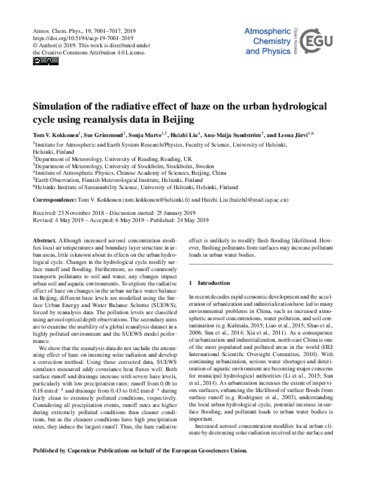 Kokkonen, T. V., Grimmond, S. orcid id iconORCID: https://orcid.org/0000-0002-3166-9415, Murto, S., Liu, H., Sundström, A.-M. and Järvi, L. (2019) Simulation of the radiative effect of haze on the urban hydrological cycle using reanalysis data in Beijing. Atmospheric Chemistry and Physics, 19. pp. 7001-7017. ISSN 1680-7316 doi: 10.5194/acp-19-7001-2019