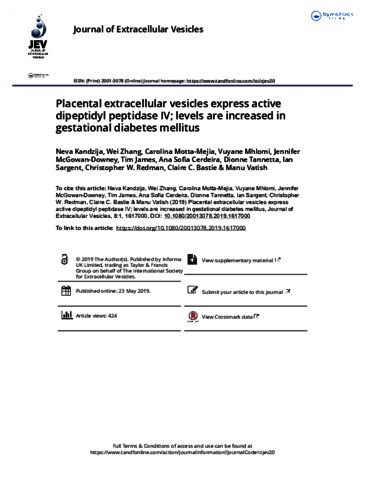 Kandzija, N., Zhang, W., Motta-Mejia, C., Mhlomi, V., McGowan-Downey, J., James, T., Cerdeira, A. S., Tannetta, D., Sargent, I., Redman, C. W., Bastie, C. C. and Vatish, M. (2019) Placental extracellular vesicles express active dipeptidyl peptidase IV; levels are increased in gestational diabetes mellitus. Journal of extracellular vesicles, 8 (1). 1617000. ISSN 2001-3078 doi: 10.1080/20013078.2019.1617000