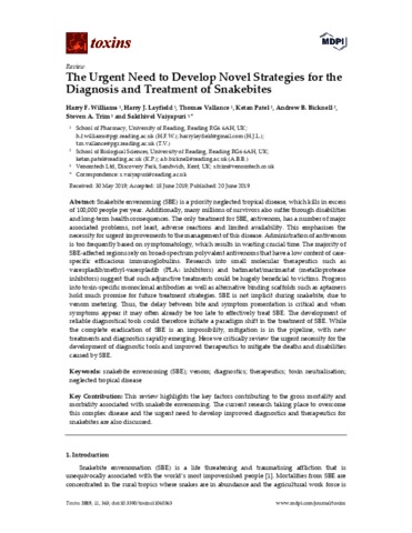 Williams, H. F., Layfield, H. J., Vallance, T., Patel, K., Bicknell, A. B., Trim, S. A. and Vaiyapuri, S. orcid id iconORCID: https://orcid.org/0000-0002-6006-6517 (2019) The urgent need to develop novel strategies for the diagnosis and treatment of snakebites. Toxins, 11 (6). 363. ISSN 2072-6651 doi: 10.3390/toxins11060363