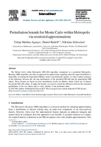 Medina-Aguayo, F., Rudolf, D. and Schweizer, N. (2020) Perturbation bounds for Monte Carlo within metropolis via restricted approximations. Stochastic Processes and their Applications, 130 (4). pp. 2200-2227. ISSN 0304-4149 doi: 10.1016/j.spa.2019.06.015