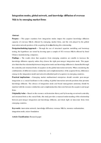 Integration modes, global networks, and knowledge diffusion in overseas M&As by emerging market firms