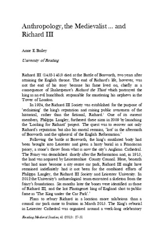 Bailey, A. E. (2015) Anthropology, the medievalist... and Richard III. Reading Medieval Studies, XLI. pp. 27-51. ISSN 0950-3129 (ISBN 9780704915534)