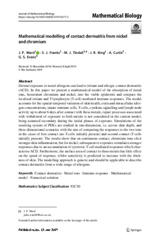 Ward, J. P., Franks, S. J., Tindall, M. J., King, J. R., Curtis, A. and Evans, G. S. (2019) Mathematical modelling of contact dermatitis from nickel and chromium. Journal of Mathematical Biology, 79 (2). pp. 595-630. ISSN 0303-6812 doi: 10.1007/s00285-019-01371-2