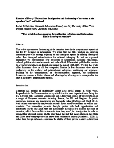 Hutchins, R. D. and Halikiopoulou, D. (2019) Enemies of liberty? Nationalism, immigration and the framing of terrorism in the agenda of the Front National. Nations and Nationalism, 26 (1). pp. 67-84. ISSN 1469-8129 doi: 10.1111/nana.12555