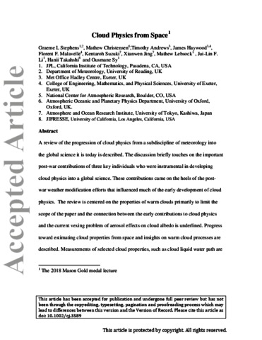 Stephens, G. L., Christensen, M., Andrews, T., Haywood, J., Malavelle, F. F., Suzuki, K., Jing, X., Lebsock, M., Li, J.-L. F., Takahshi, H. and Sy, O. (2019) Cloud physics from space. Quarterly Journal of the Royal Meteorological Society, 145 (724). pp. 2854-2875. ISSN 1477-870X doi: 10.1002/qj.3589