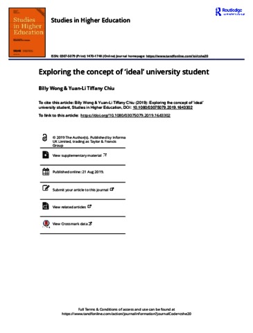 This paper contributes to our understanding of the ‘ideal’ university student – a working concept that promotes a more transparent conversation about the explicit, implicit and idealistic expectations of students in higher education. Drawing on Weber’s theory of ideal types, we explore university staff and students’ conceptualisation of the ‘ideal’ student. Informed by 20 focus groups with 75 university staff and students, we focus on how the concept of ‘ideal’ student is perceived, challenged and negotiated. We argue that the ‘ideal’ student has important conceptual and practical implications for higher education, especially the importance of explicitness and the dangers of presumptions. The concept has the potential to bridge differences and manage expectations between lecturers and students, which have been stretched due to consumerism, by offering a platform where expectations of university students are elaborated. We present a working definition of ‘ideal’ university student, which, we argue, encompasses desirability, imperfection and realism.